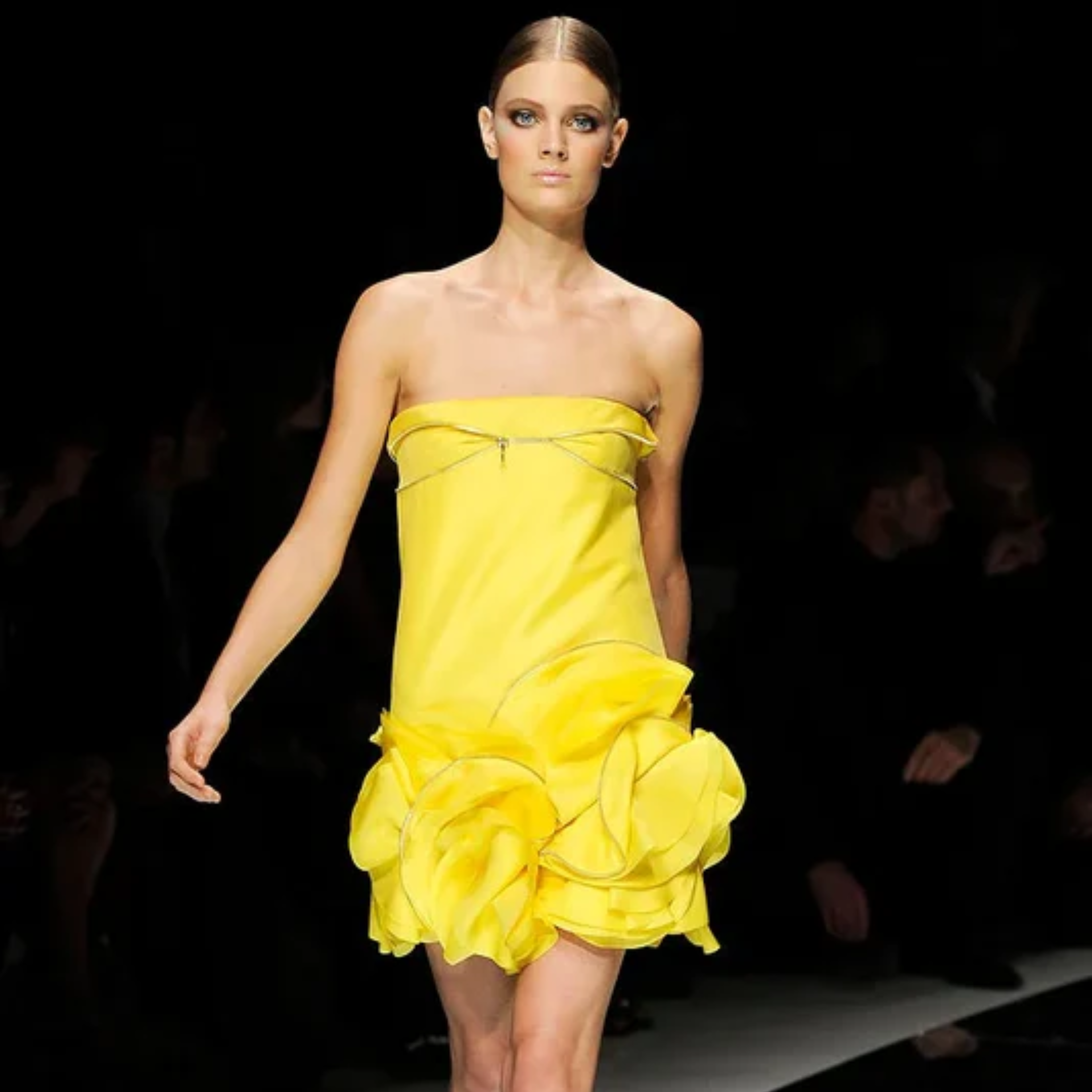 Step into the spotlight with this stunning Versace strapless dress from the iconic 2009 Runway Collection. Crafted from luxurious 100% silk, this vibrant yellow masterpiece exudes elegance and sophistication, perfect for high-profile events or collector's showcases.